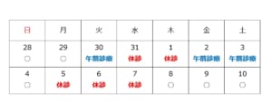 9(金)11(日)12(月)23(金)は院長不在です。