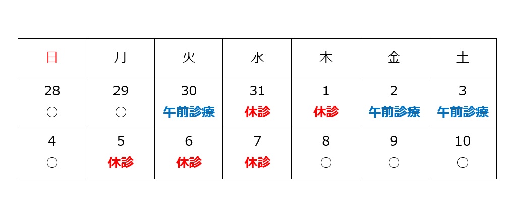 1/1(木) 1/5(月)~1/7(水)1/25(日)は臨時休診となります。